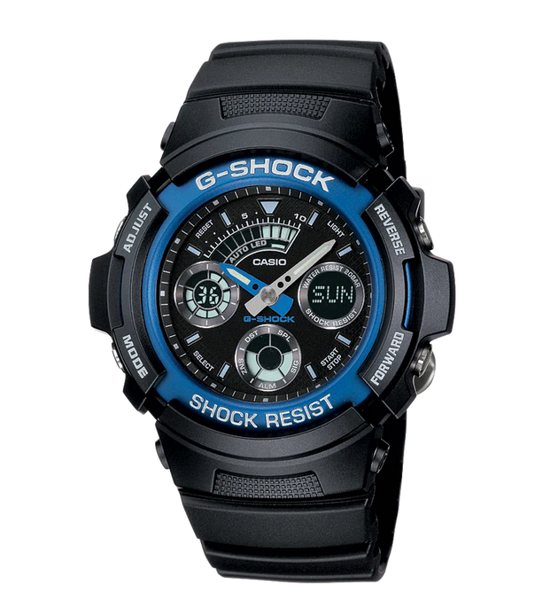 This model combine the best of digital and analogue in tough G-SHOCK designs. Buttons are recessed to protect them from impact, and variations are available in a choice of three sporty bezel colours: silver, red, or blue.